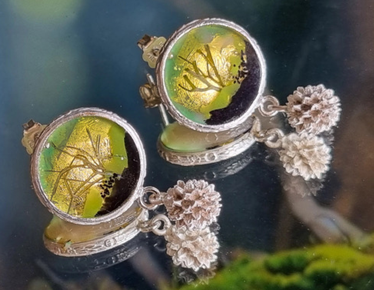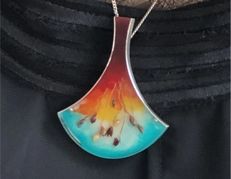 Vania creates microlandscapes out of painterly layers of resin encased in sterling silver and embedded with daily organic materials such as chia seeds, poppy, quinoa or amaranth. Each piece is completely handmade – an abstract artistic rendering of the experience of a natural landscape. The microlandscape lures us in and we feel the enchanting beauty of nature.